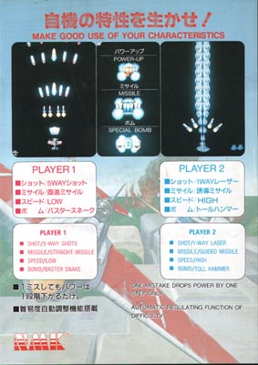 1Pは5WAYショット+ミサイル、2Pはレーザー+ホーミングでおまけにスピードが速い。