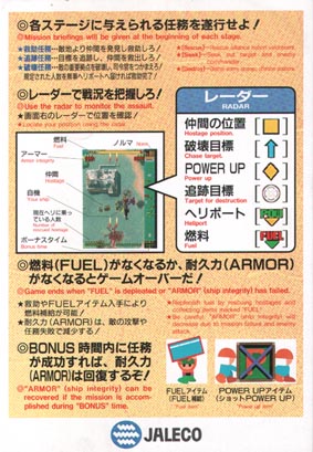 自力スクロール型でショットボタンで敵機を破壊しつつ自機の離着陸ボタンを使い、ステージ中の捕虜を助けヘリポートに連れて行けばOKです。